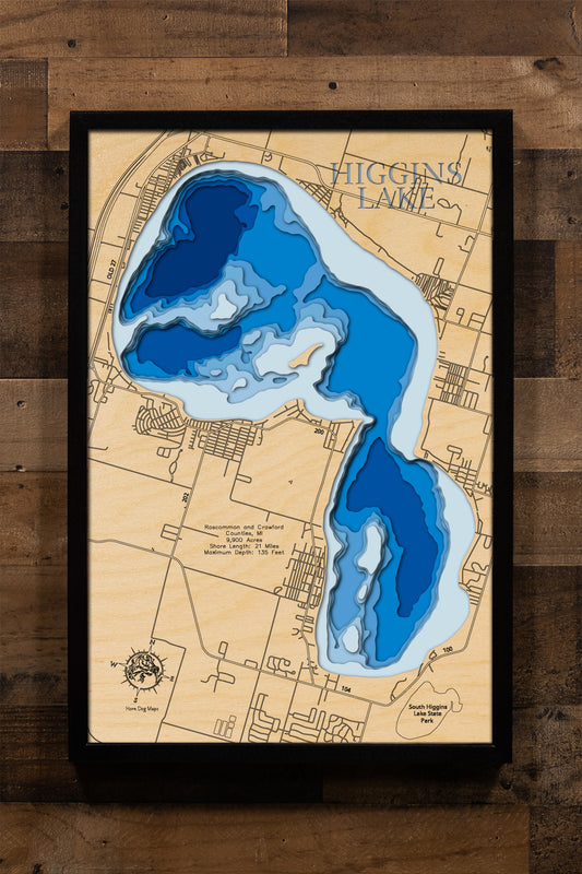 Our standard maps feature 8 total layers: one natural birch land layer with a clear coat finish, plus 7 water layers that transition from light blue in the shallows to deep navy in the deepest parts of the lake. For those who want even more detail and drama, our HD maps use 15 layers total with 14 water layers, creating an incredibly detailed gradient that showcases every contour of the lakebed.
