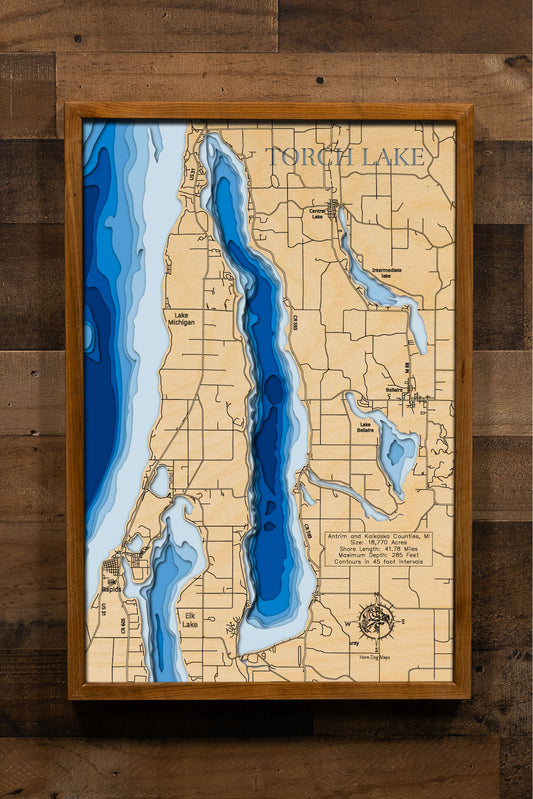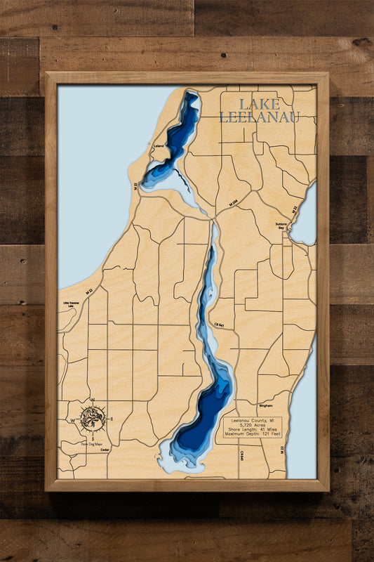When you choose one of our custom lake maps, you're getting a one-of-a-kind piece of functional art that captures the depth and beauty of your favorite lake. Each map is carefully constructed using multiple layers of precision-cut Baltic birch, creating a stunning three-dimensional representation of the actual bathymetry (underwater topography) of the lake.