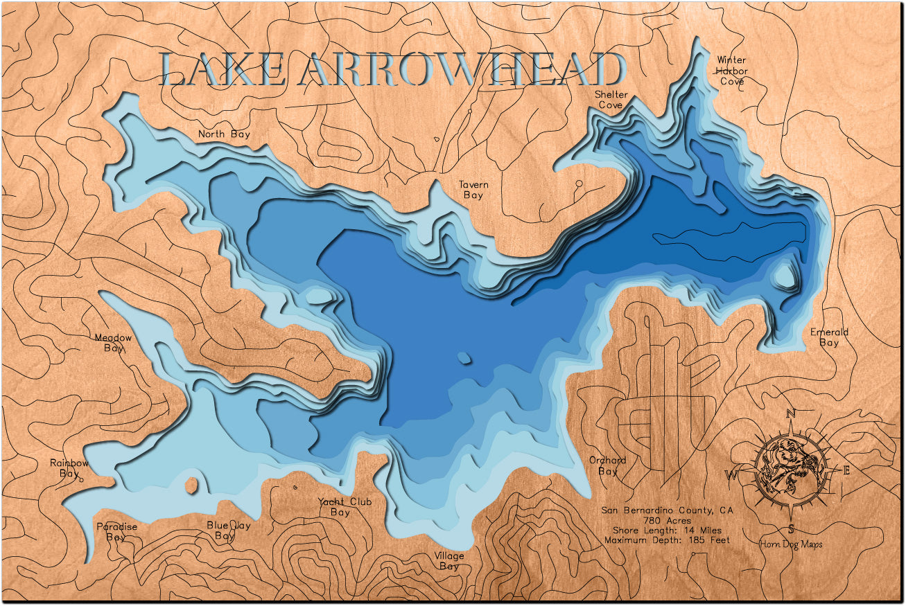 From fishing and kayaking to serene hikes along its shores, Lake Arrowhead in San Bernardino County, CA offers endless opportunities for enjoyment. This detailed 3D lake map brings the essence of the lake into your home as decor and art, making it perfect for your cabin or living space.