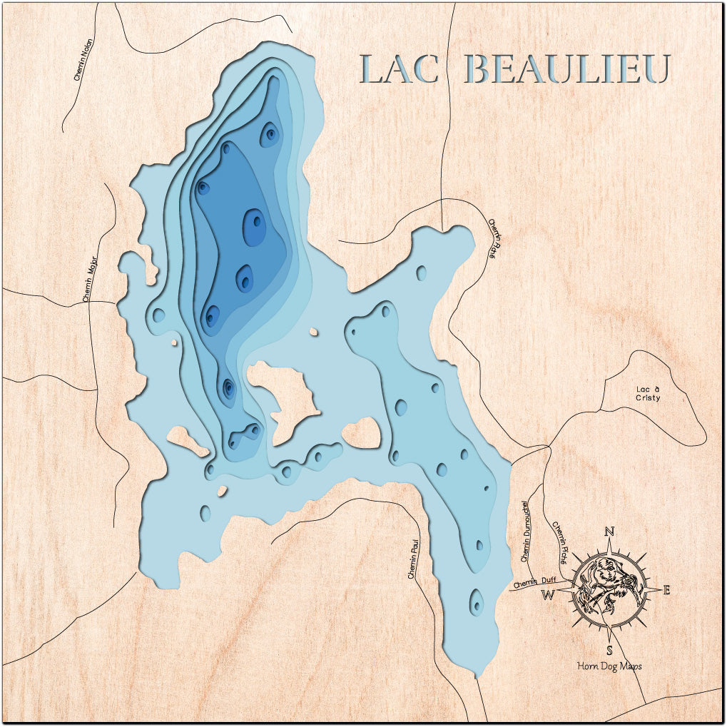 Visitors to Lake Beaulieu in Quebec, Canada can enjoy activities like fishing, boating, and hiking. This 3D lake map is not just decor but a piece of art that brings memories of your cabin or lakeside retreat into your home.