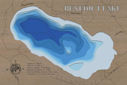 Perfect for cabin decor or home art, this 3D lake map is a beautiful tribute to Benedict Lake in Hubbard County, MN. It helps you preserve the special memories of time spent by the lake.