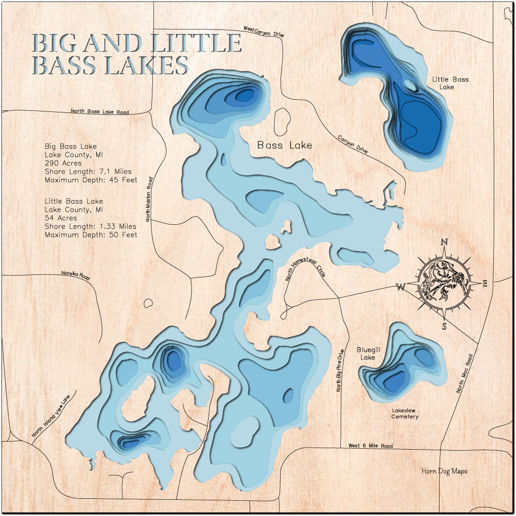 Visitors to Big and Little Bass Lakes in Lake County, MI can enjoy activities like fishing, boating, and hiking. This 3D lake map is not just decor but a piece of art that brings memories of your cabin or lakeside retreat into your home.