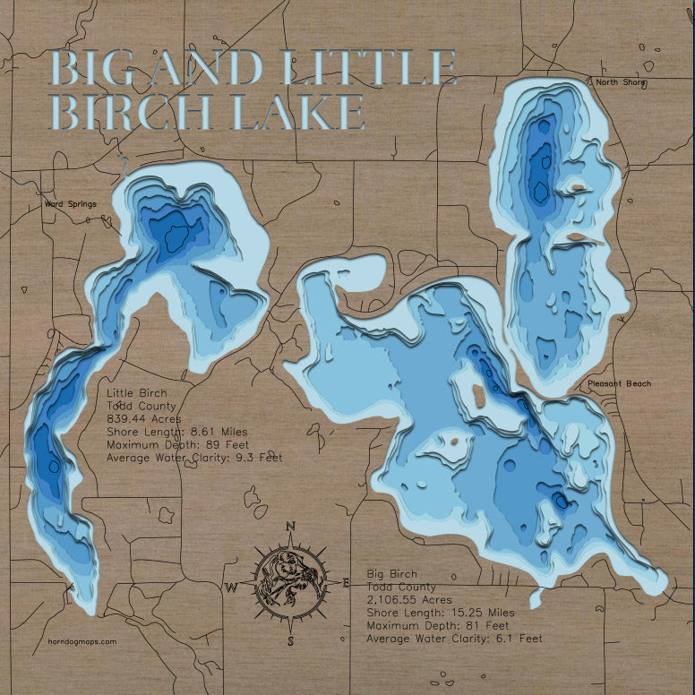 Visitors to Big and Little Birch Lakes in Todd County, MN can enjoy activities like fishing, boating, and hiking. This 3D lake map is not just decor but a piece of art that brings memories of your cabin or lakeside retreat into your home.