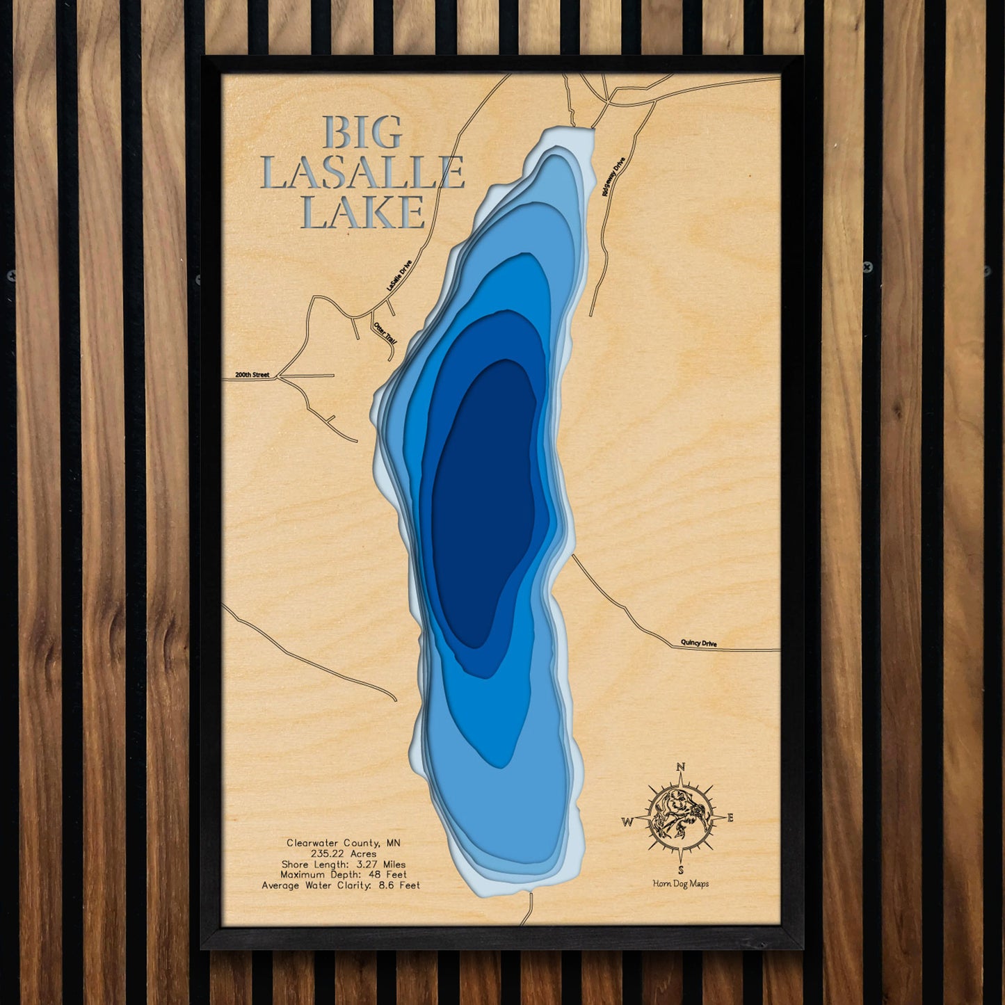Enhance your home or cabin with this stunning 3D lake map of Big LaSalle Lake in Clearwater County, MN. It’s a beautiful way to keep your lakeside memories alive.