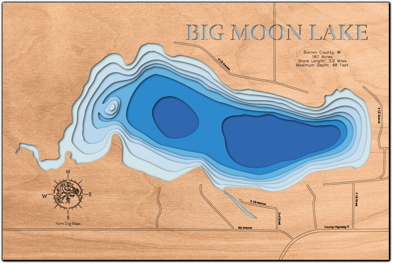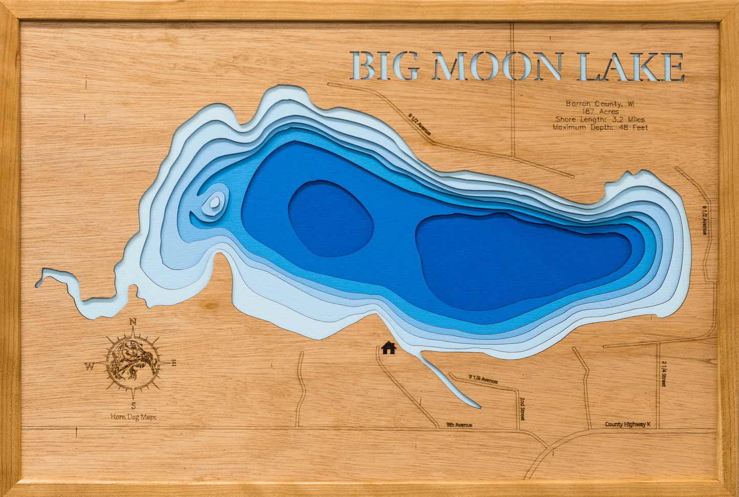 Celebrate the beauty of Big Moon Lake in Barron County, WI with this detailed 3D lake map. It’s more than decor—it’s a piece of art that keeps your favorite lake close to home.