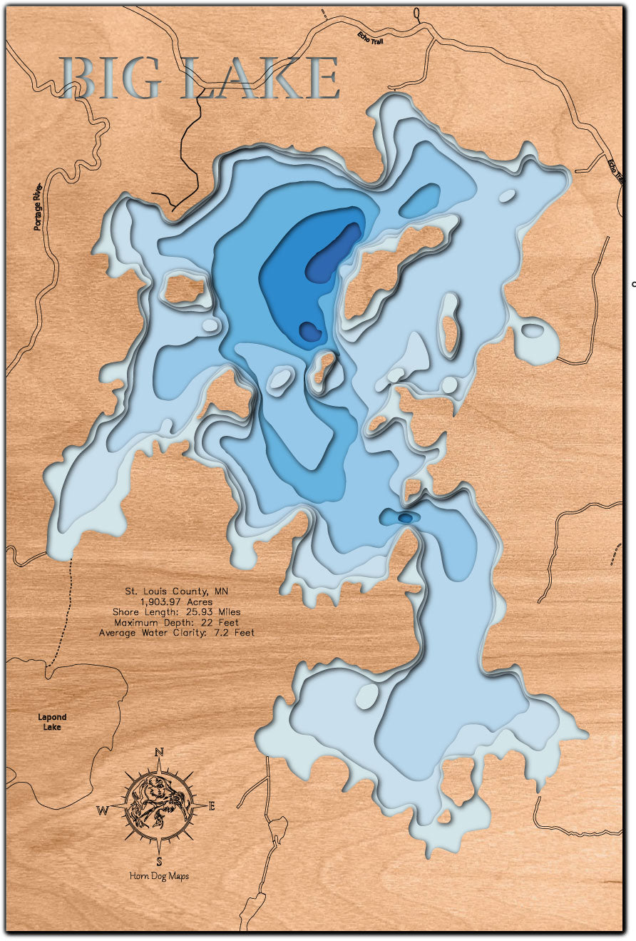This 3D lake map is designed to reflect the unique beauty of Big Lake in St. Louis County, MN. It’s the perfect piece to bring the outdoors into your home.