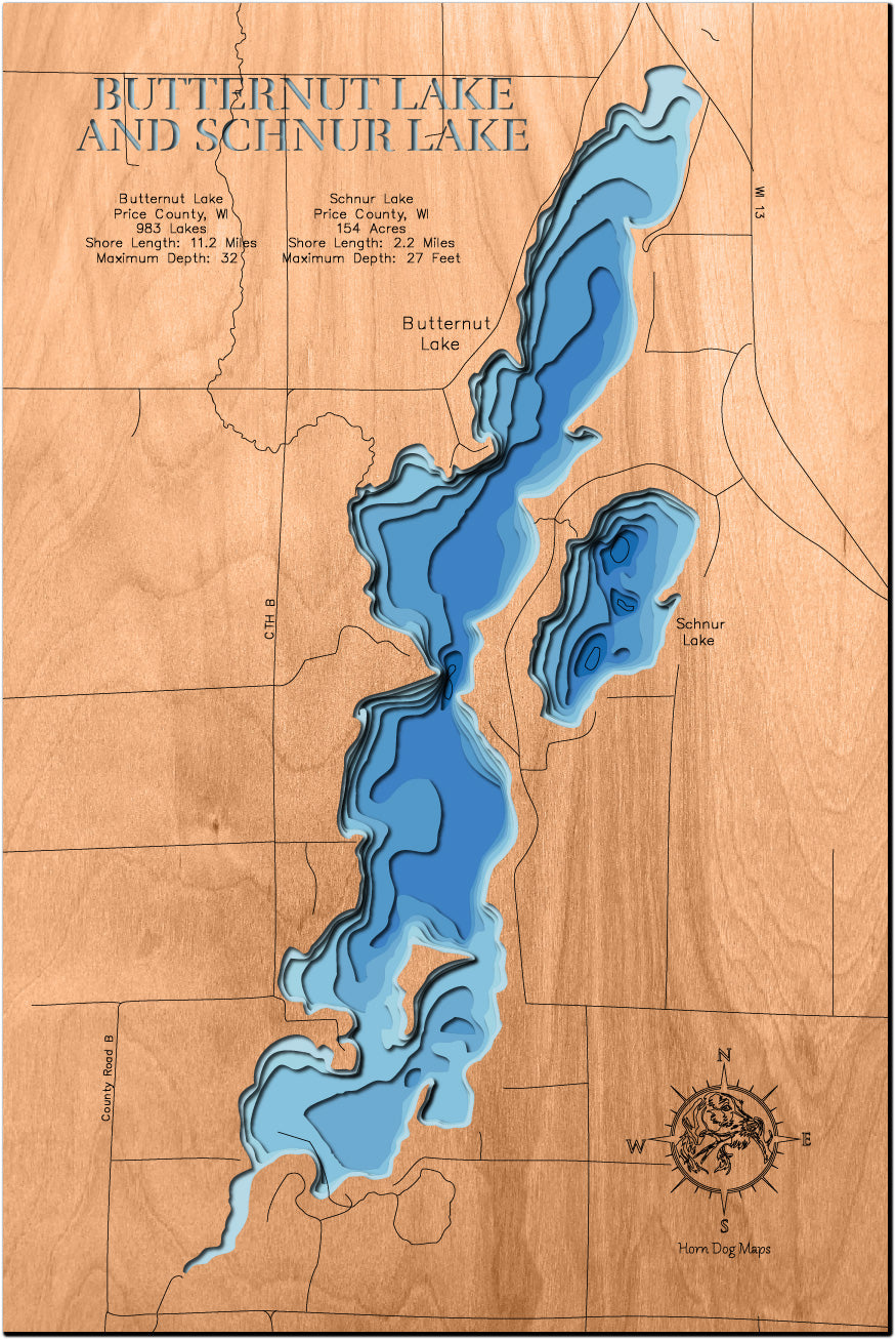 This 3D lake map is designed to reflect the unique beauty of Butternut Lake and Schnur Lake in Price County, WI. It’s the perfect piece to bring the outdoors into your home.