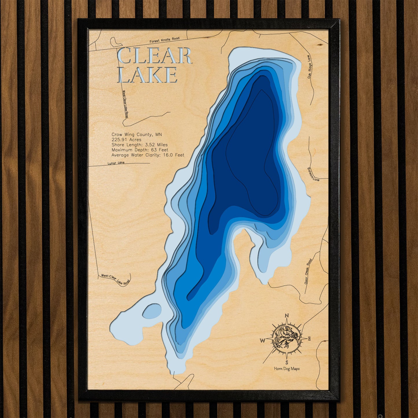 From fishing and kayaking to serene hikes along its shores, Clear Lake in Crow Wing County, MN offers endless opportunities for enjoyment. This detailed 3D lake map brings the essence of the lake into your home as decor and art, making it perfect for your cabin or living space.