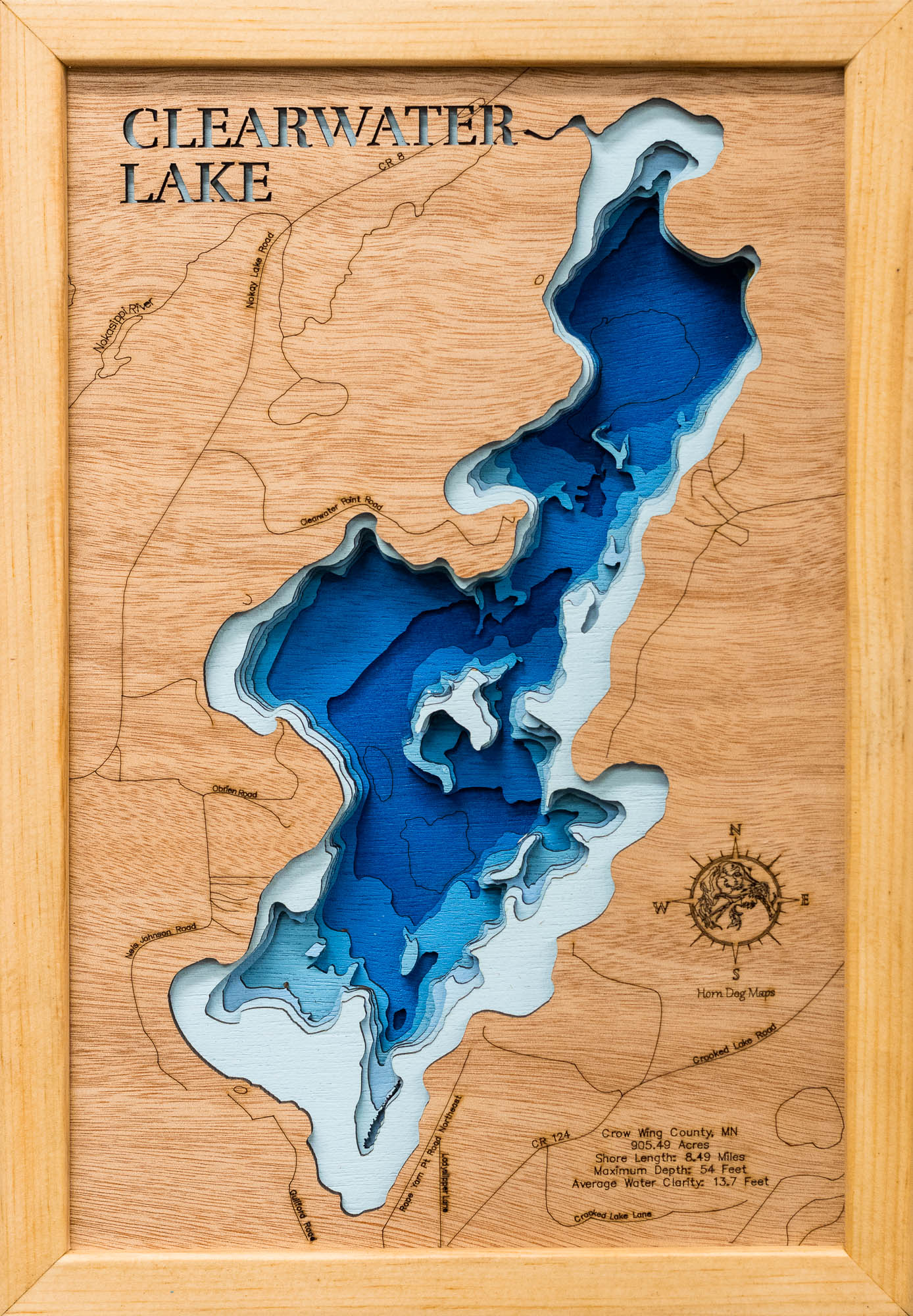 From fishing and kayaking to serene hikes along its shores, Clearwater Lake in Crow Wing County, MN offers endless opportunities for enjoyment. This detailed 3D lake map brings the essence of the lake into your home as decor and art, making it perfect for your cabin or living space.