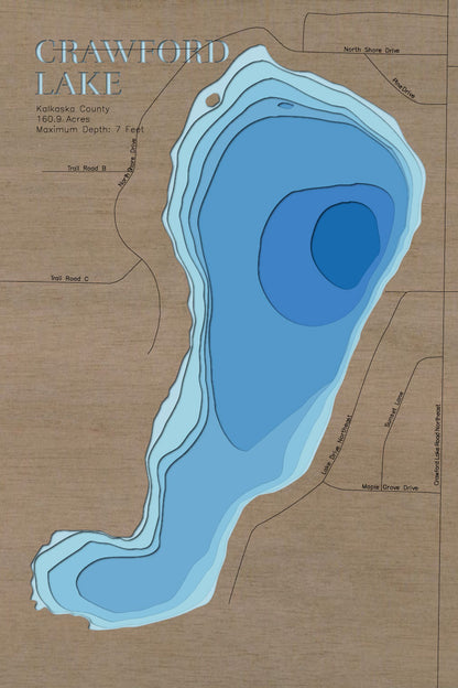 From fishing and kayaking to serene hikes along its shores, Crawford Lake in Kalkaska County, MI offers endless opportunities for enjoyment. This detailed 3D lake map brings the essence of the lake into your home as decor and art, making it perfect for your cabin or living space.