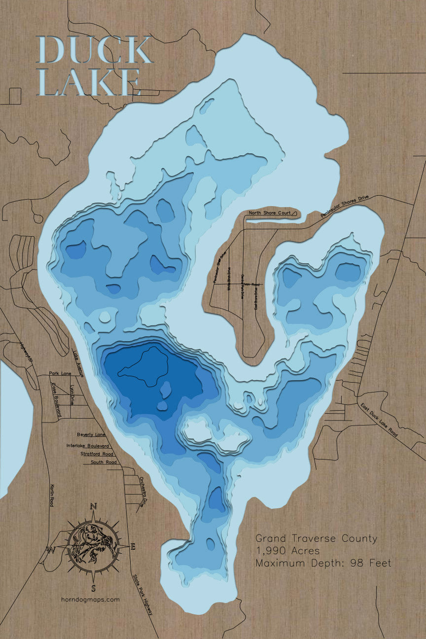 Duck Lake, a substantial 1,930-acre body of water, is a prized natural resource nestled in Grand Traverse County, Michigan, near the village of Interlochen. This Michigan lake, known for its significant depth reaching a maximum of 98 feet, offers a complex underwater topography. Detailed bathymetric maps, often featuring 10-foot contour intervals, provide valuable insights into its structure, aiding navigators and anglers exploring its clear waters.