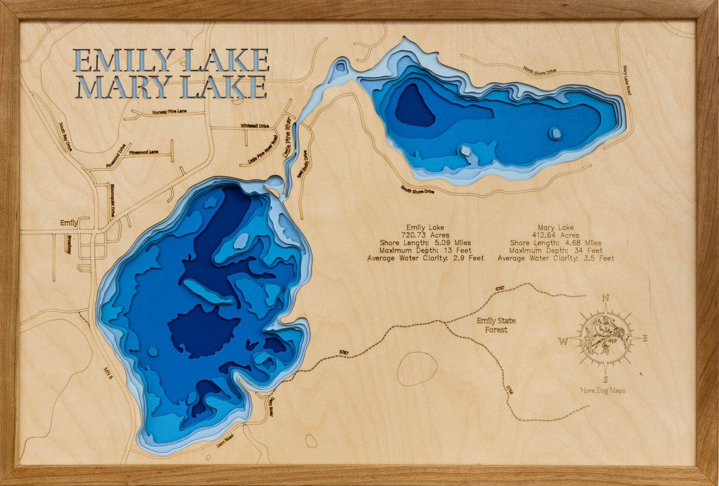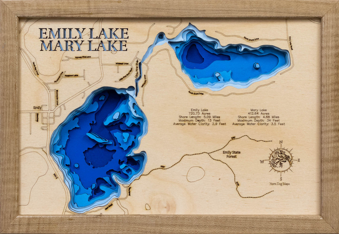 From fishing and kayaking to serene hikes along its shores, Lake Emily and Lake Mary in Crow Wing County, MN offers endless opportunities for enjoyment. This detailed 3D lake map brings the essence of the lake into your home as decor and art, making it perfect for your cabin or living space.