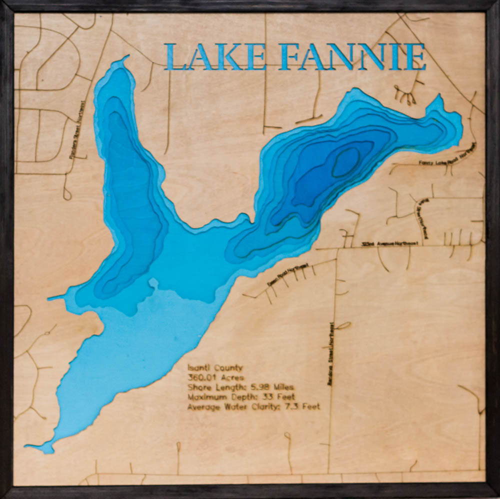 Visitors to Fannie Lake in Isanti County, MN can enjoy activities like fishing, boating, and hiking. This 3D lake map is not just decor but a piece of art that brings memories of your cabin or lakeside retreat into your home.