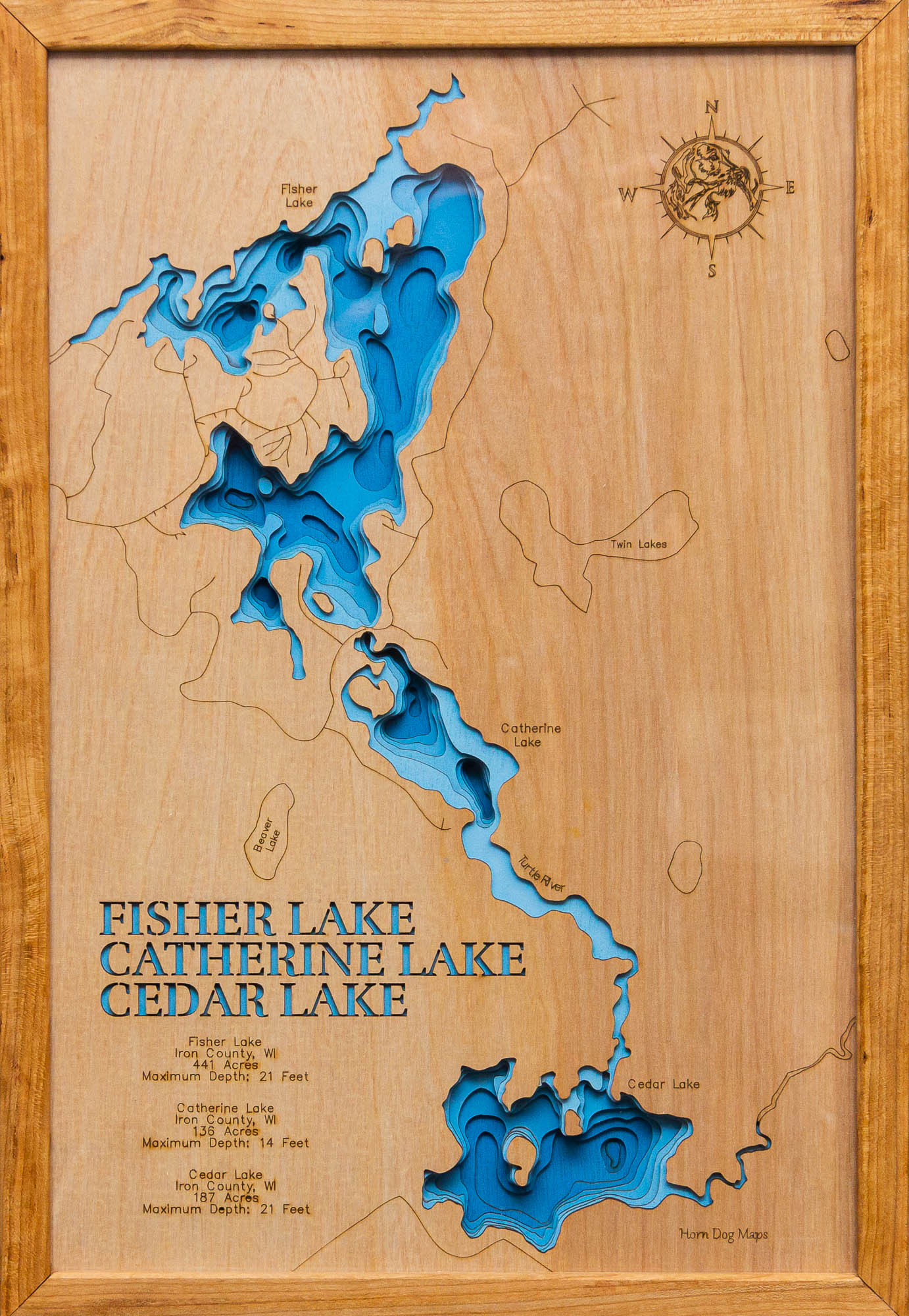 From fishing and kayaking to serene hikes along its shores, Fisher, Catherine, and Cedar (Iron)Fisher, Catherine, and Cedar Lakes in Iron County, WI offers endless opportunities for enjoyment. This detailed 3D lake map brings the essence of the lake into your home as decor and art, making it perfect for your cabin or living space.