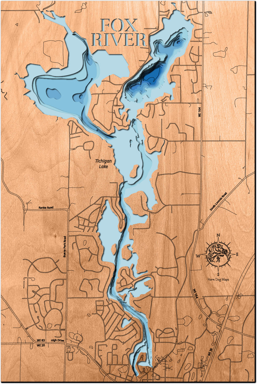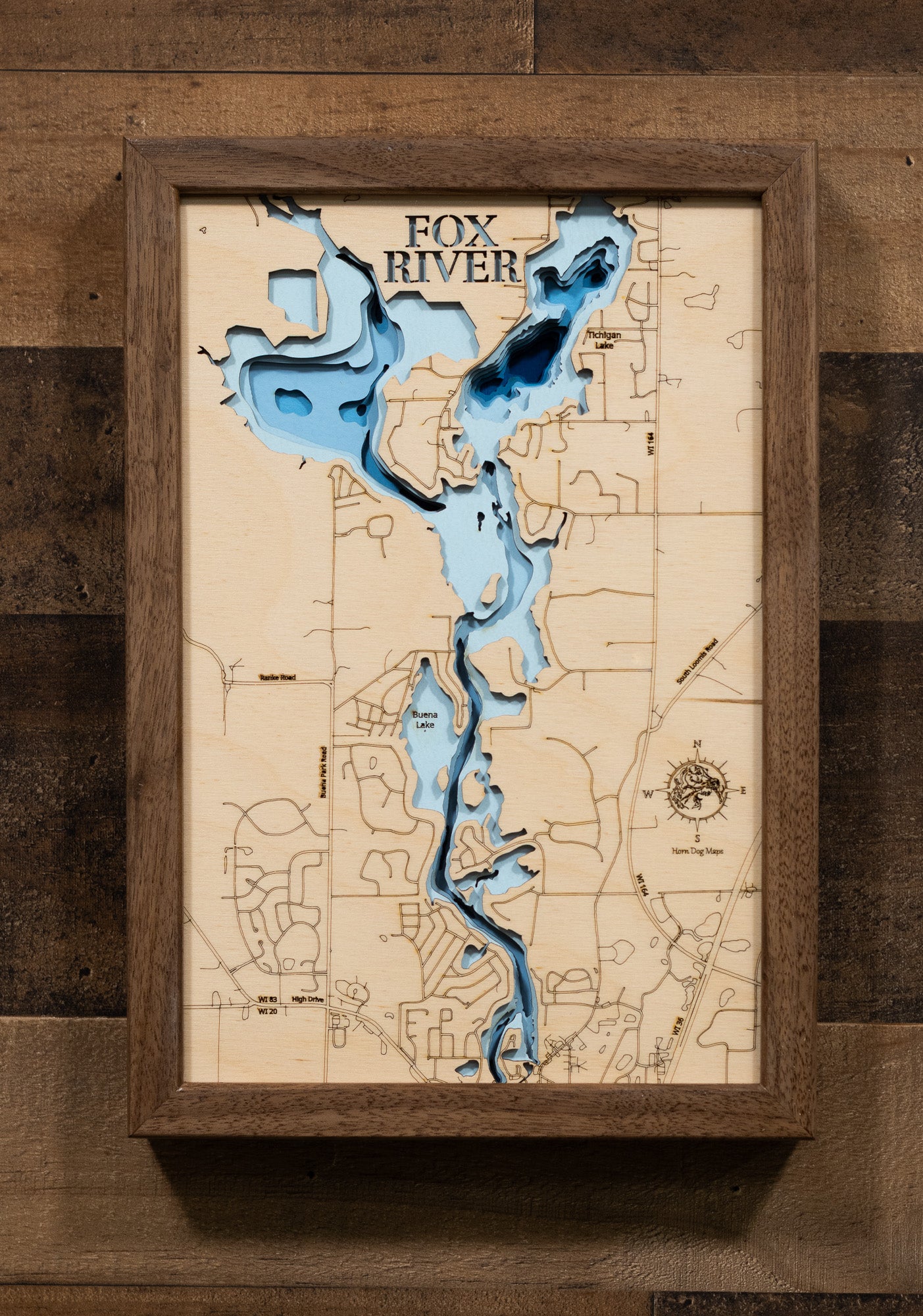 This 3D lake map of Fox River from Lake Tichigan to Waterford Dam, Racine County, WI is not just decor—it’s a handcrafted piece of art that helps you bring the serenity of the lake into your space.