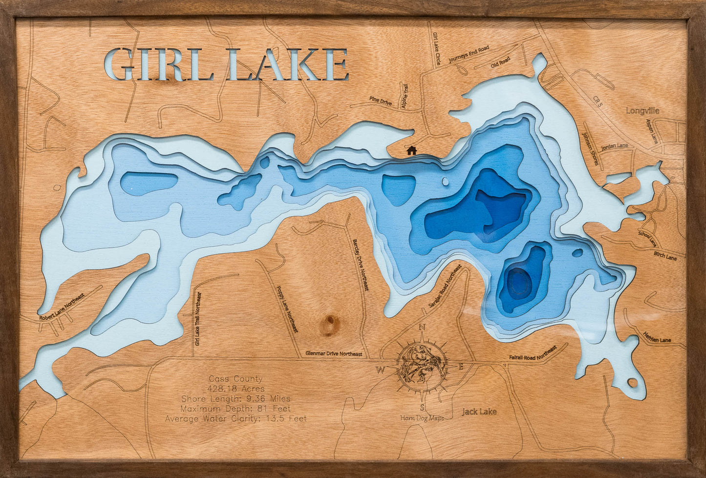 From fishing and kayaking to serene hikes along its shores, Girl Lake in Cass County, MN offers endless opportunities for enjoyment. This detailed 3D lake map brings the essence of the lake into your home as decor and art, making it perfect for your cabin or living space.