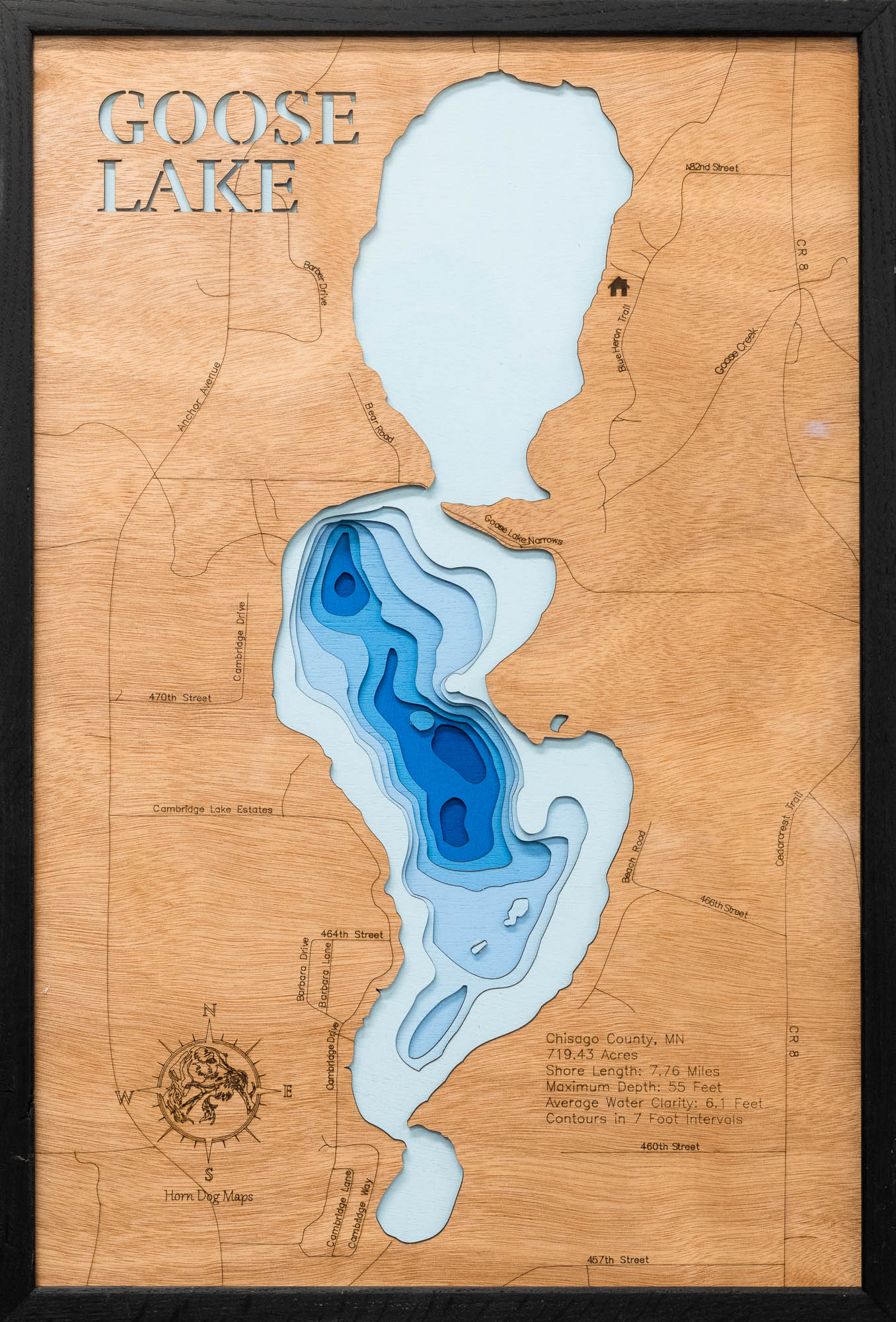 Celebrate the beauty of Goose Lake in Chisago County, MN with this detailed 3D lake map. It’s more than decor—it’s a piece of art that keeps your favorite lake close to home.