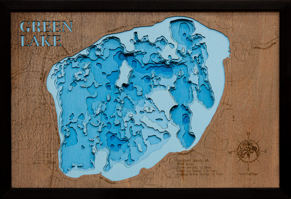 From fishing and kayaking to serene hikes along its shores, Green Lake in Kandiyohi County, MN offers endless opportunities for enjoyment. This detailed 3D lake map brings the essence of the lake into your home as decor and art, making it perfect for your cabin or living space.