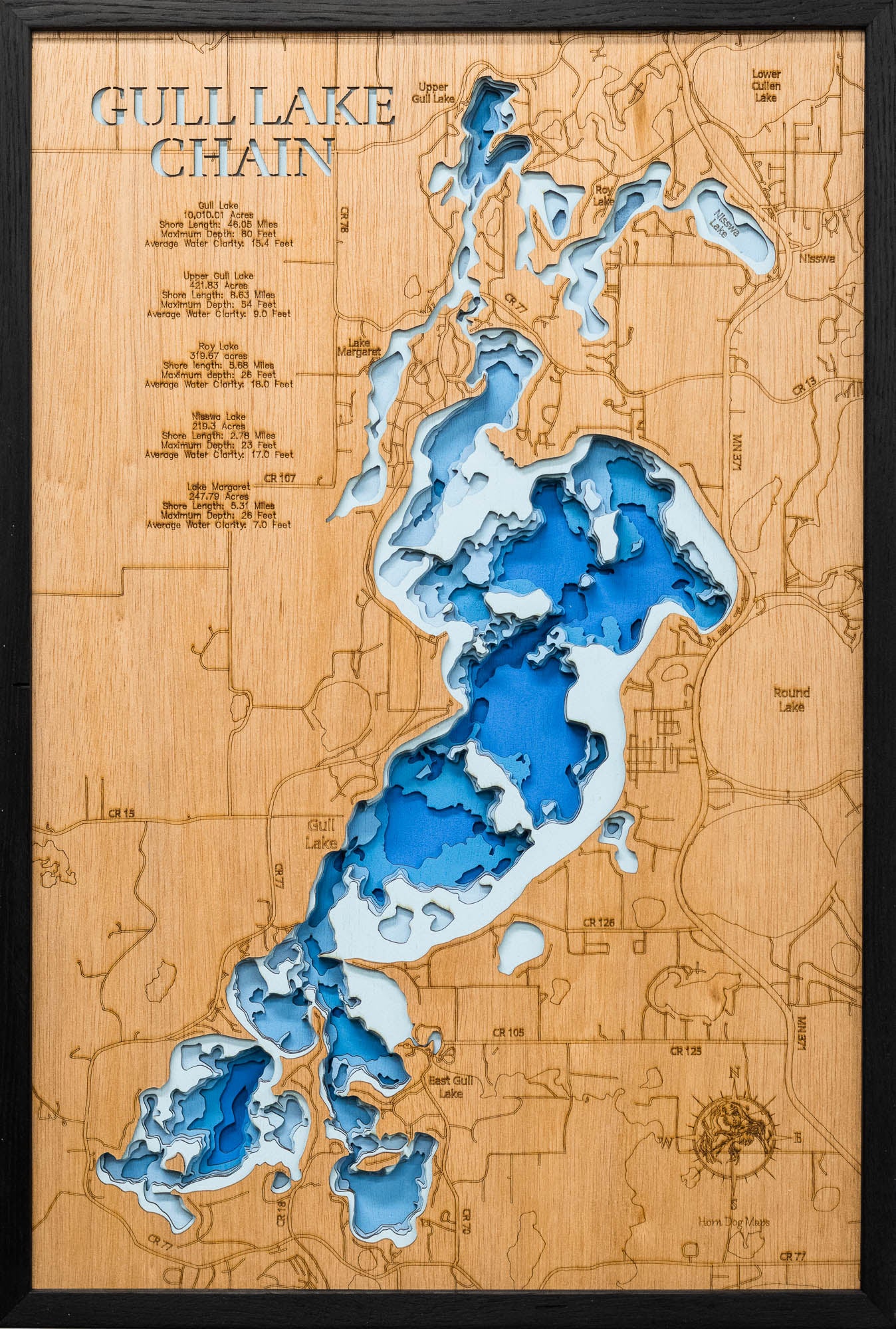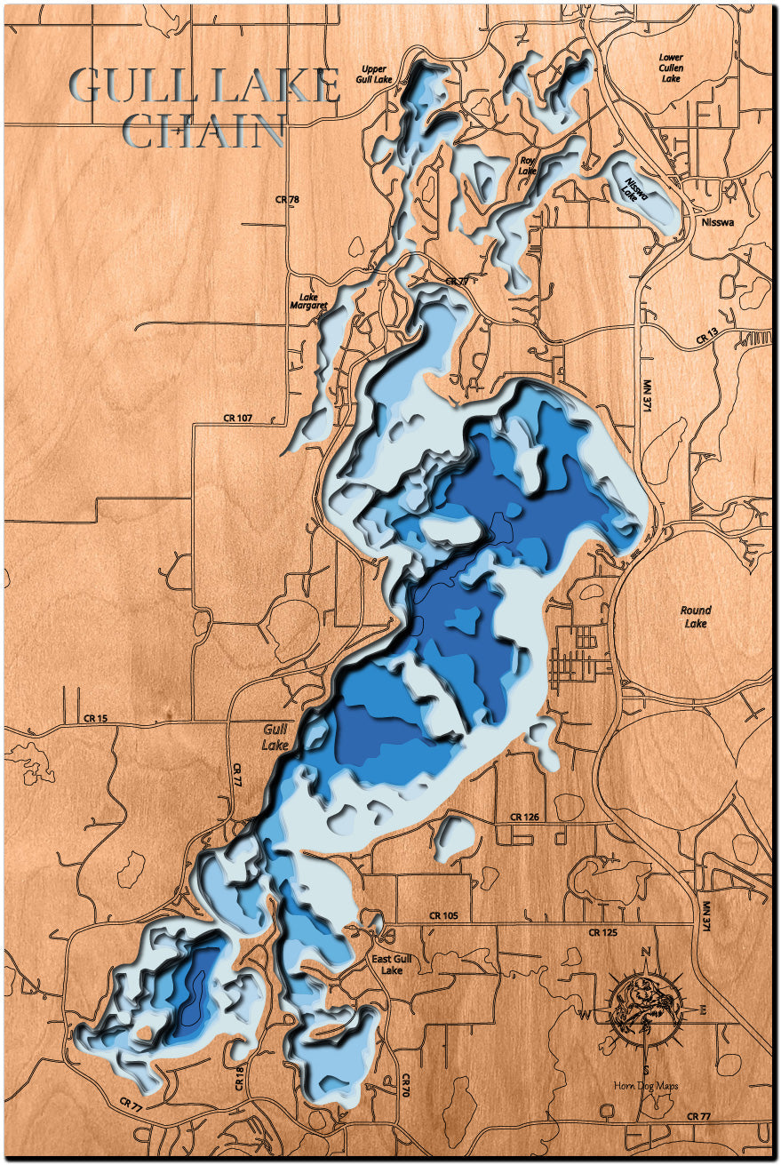 From fishing and kayaking to serene hikes along its shores, Gull Lake Chain in Cass County, MN offers endless opportunities for enjoyment. This detailed 3D lake map brings the essence of the lake into your home as decor and art, making it perfect for your cabin or living space.