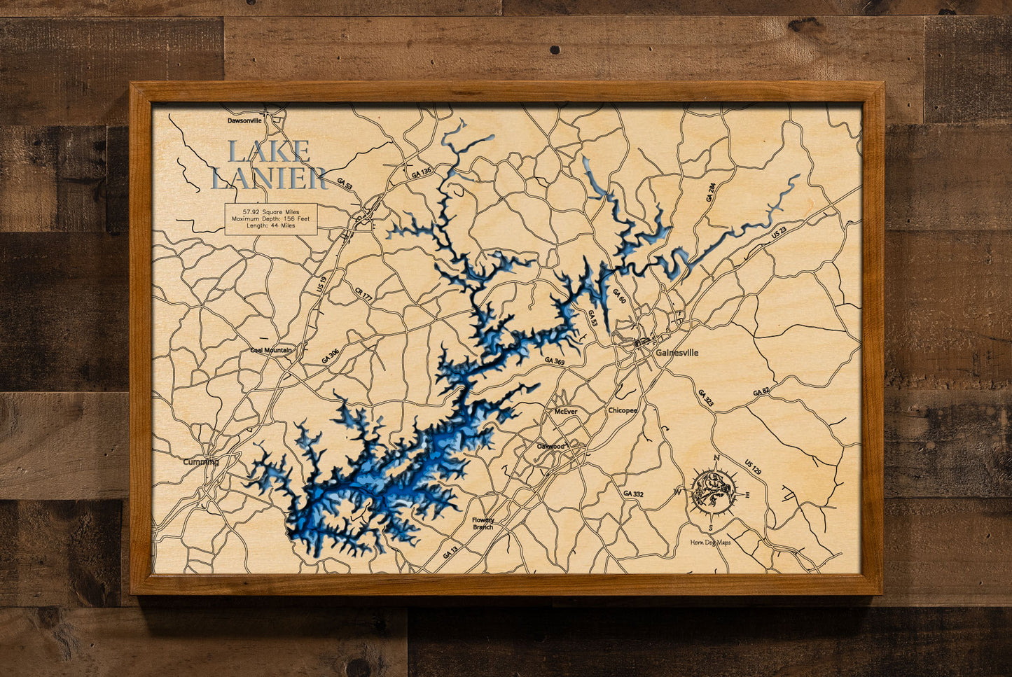 Lake Lanier, a sprawling 38,000-acre reservoir with 692 miles of shoreline, is nestled in the foothills of the Georgia Blue Ridge Mountains, touching Dawson, Forsyth, Gwinnett, Hall, and Lumpkin Counties. Created by the Buford Dam on the Chattahoochee and Chestatee Rivers, it is a premier recreational destination in the Southeast. The lake is renowned for its excellent fishing, particularly for spotted bass, largemouth bass, and striped bass. Numerous boat ramps and marinas provide access for anglers and recreational boaters alike.