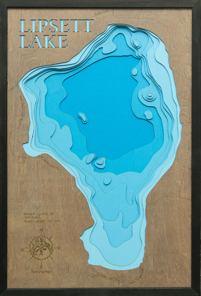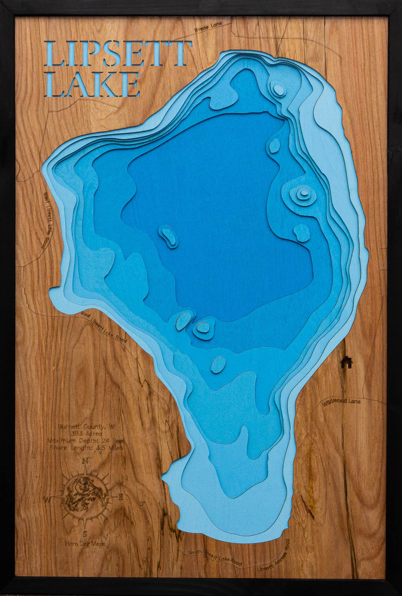 Enhance your home or cabin with this stunning 3D lake map of Lipsett Lake in Burnett County, WI. It’s a beautiful way to keep your lakeside memories alive.