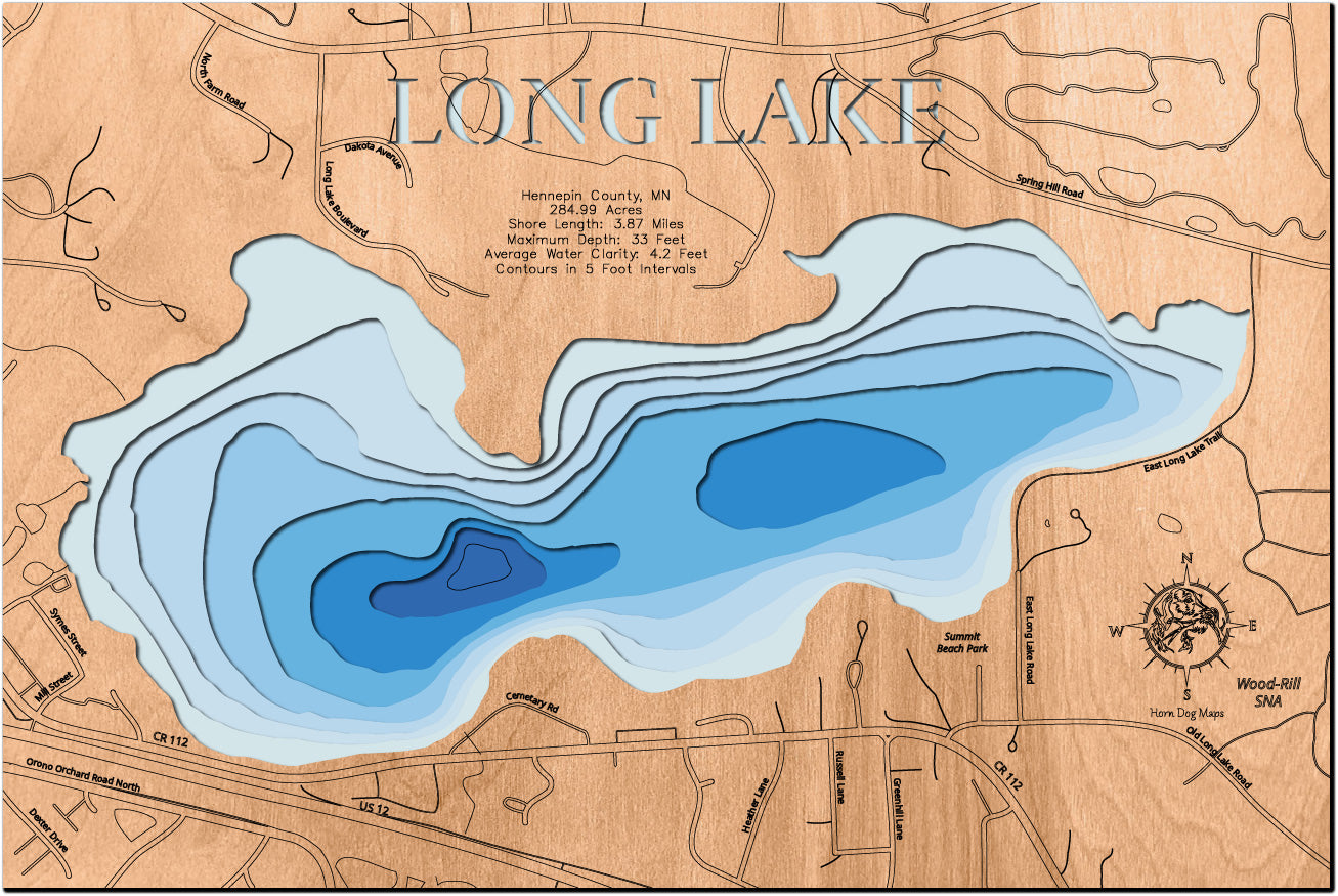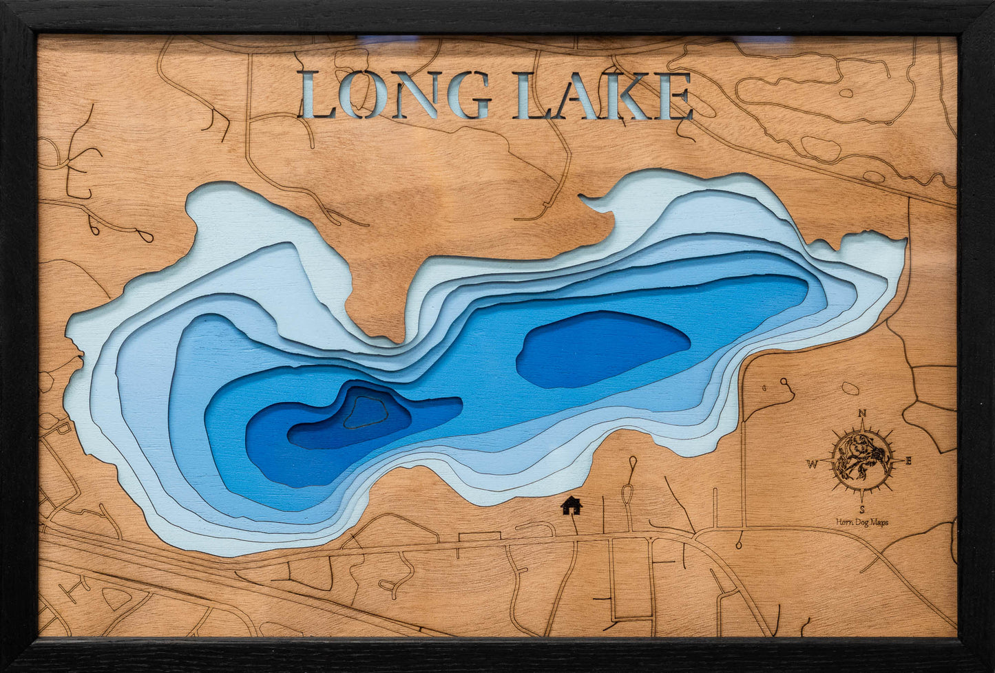 From fishing and kayaking to serene hikes along its shores, Long Lake in Hennepin County, MN offers endless opportunities for enjoyment. This detailed 3D lake map brings the essence of the lake into your home as decor and art, making it perfect for your cabin or living space.