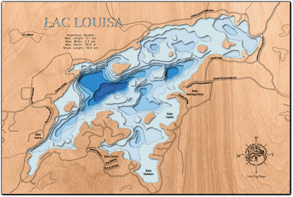 From fishing and kayaking to serene hikes along its shores, Lac Louisa in Argenteuil, Quebec, Canada offers endless opportunities for enjoyment. This detailed 3D lake map brings the essence of the lake into your home as decor and art, making it perfect for your cabin or living space.