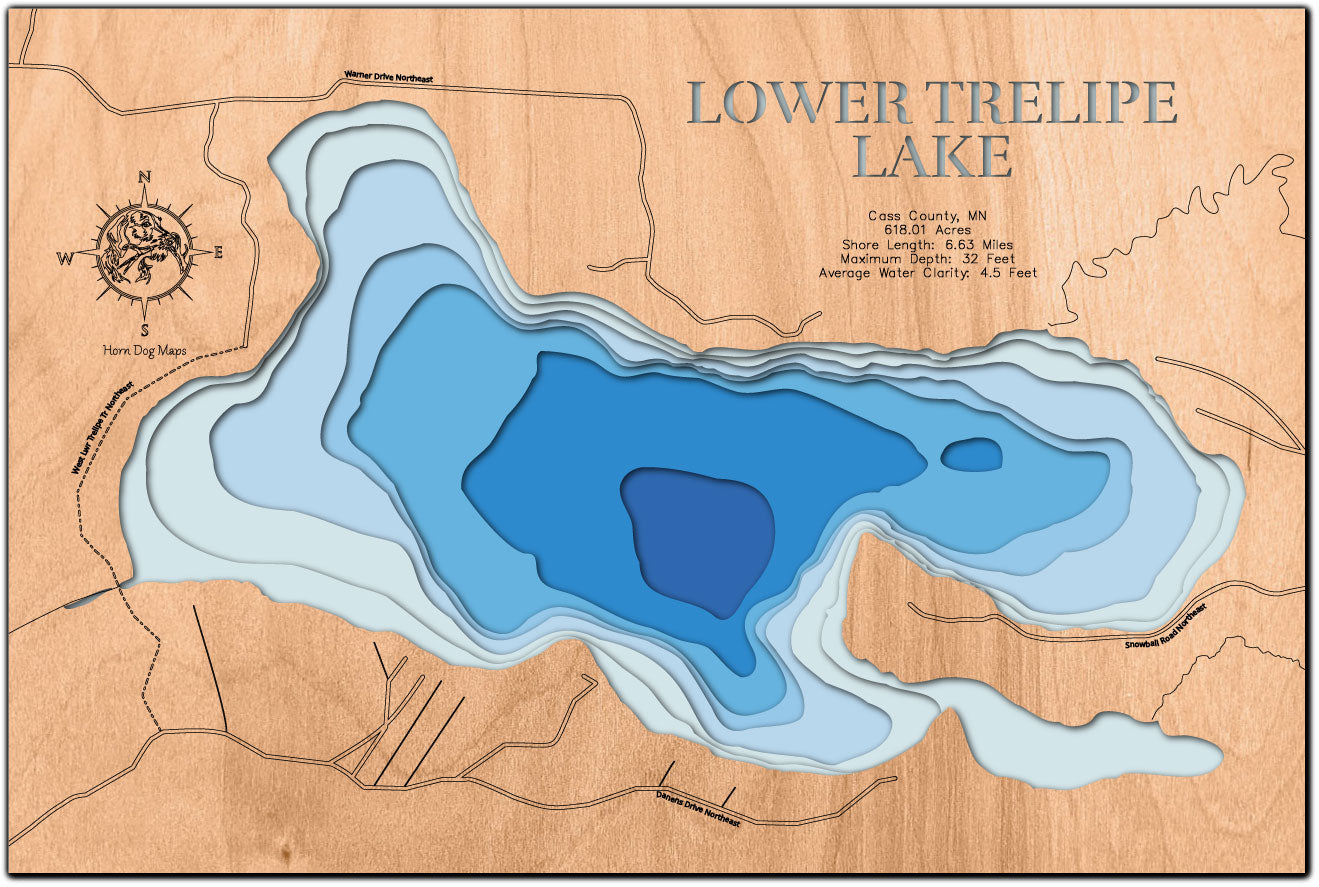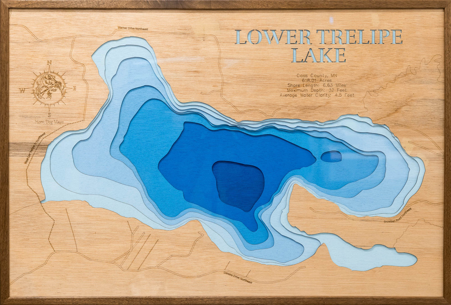 From fishing and kayaking to serene hikes along its shores, Lower Trelipe Lake in Cass County, MN offers endless opportunities for enjoyment. This detailed 3D lake map brings the essence of the lake into your home as decor and art, making it perfect for your cabin or living space.