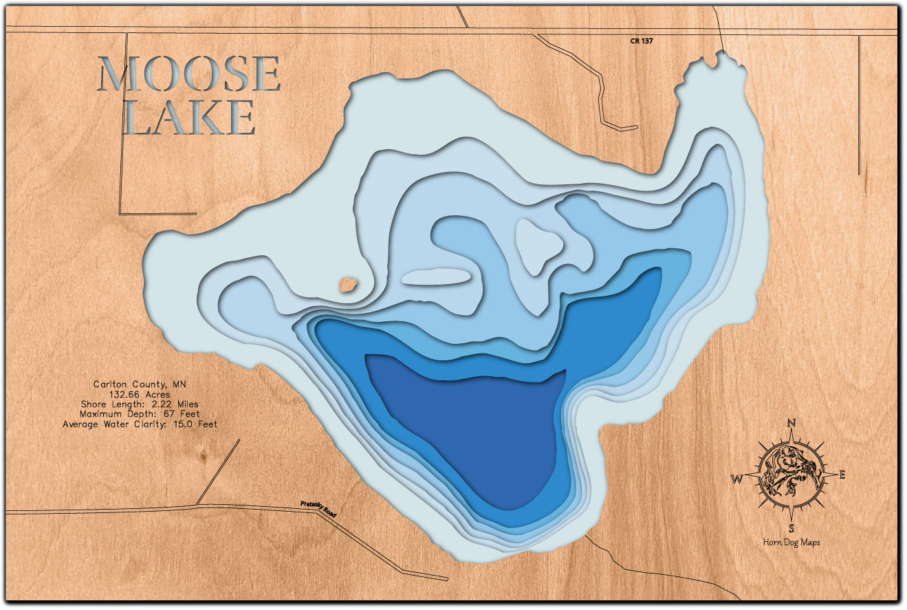 This 3D lake map is designed to reflect the unique beauty of Moose Lake in Carlton County, MN. It’s the perfect piece to bring the outdoors into your home.