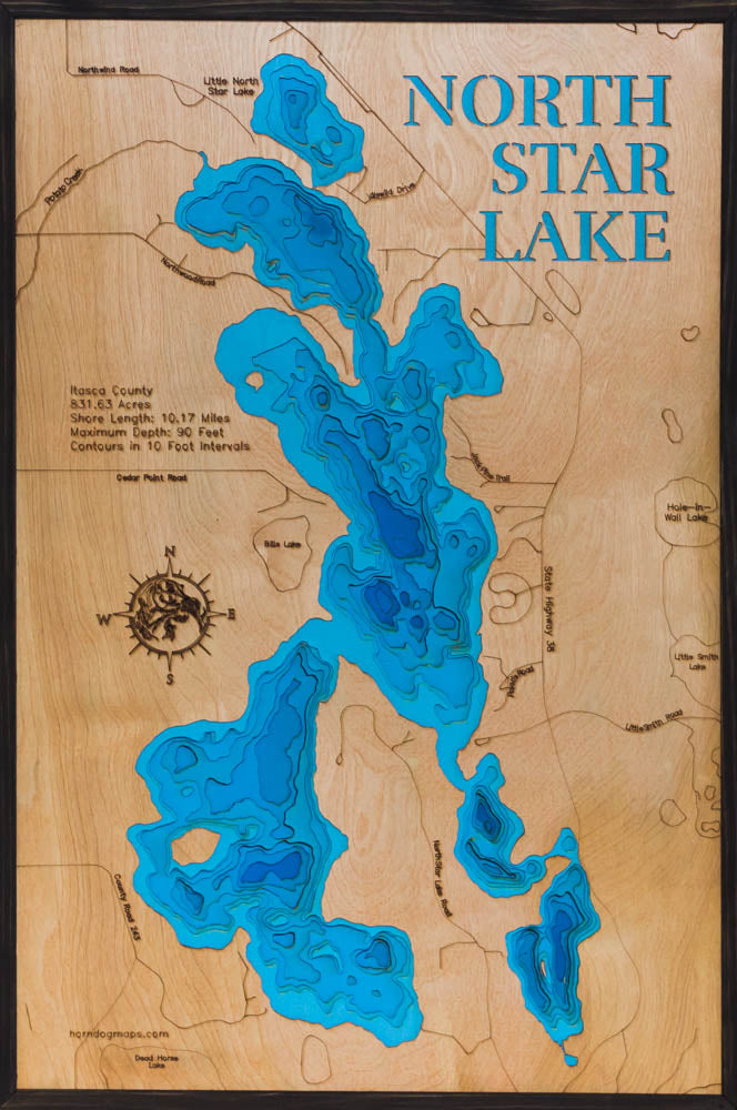 From fishing and kayaking to serene hikes along its shores, North Star Lake in Itasca County, MN offers endless opportunities for enjoyment. This detailed 3D lake map brings the essence of the lake into your home as decor and art, making it perfect for your cabin or living space.