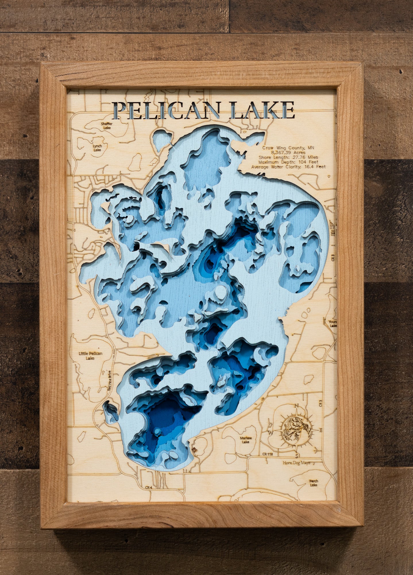 From fishing and kayaking to serene hikes along its shores, Pelican Lake in Crow Wing County, MN offers endless opportunities for enjoyment. This detailed 3D lake map brings the essence of the lake into your home as decor and art, making it perfect for your cabin or living space.