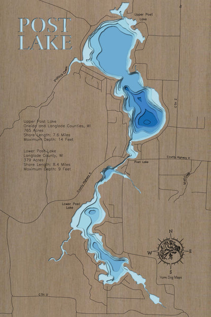 From fishing and kayaking to serene hikes along its shores, Upper and Lower Post Lakes in Oneida and Langlade Counties, WI offers endless opportunities for enjoyment. This detailed 3D lake map brings the essence of the lake into your home as decor and art, making it perfect for your cabin or living space.