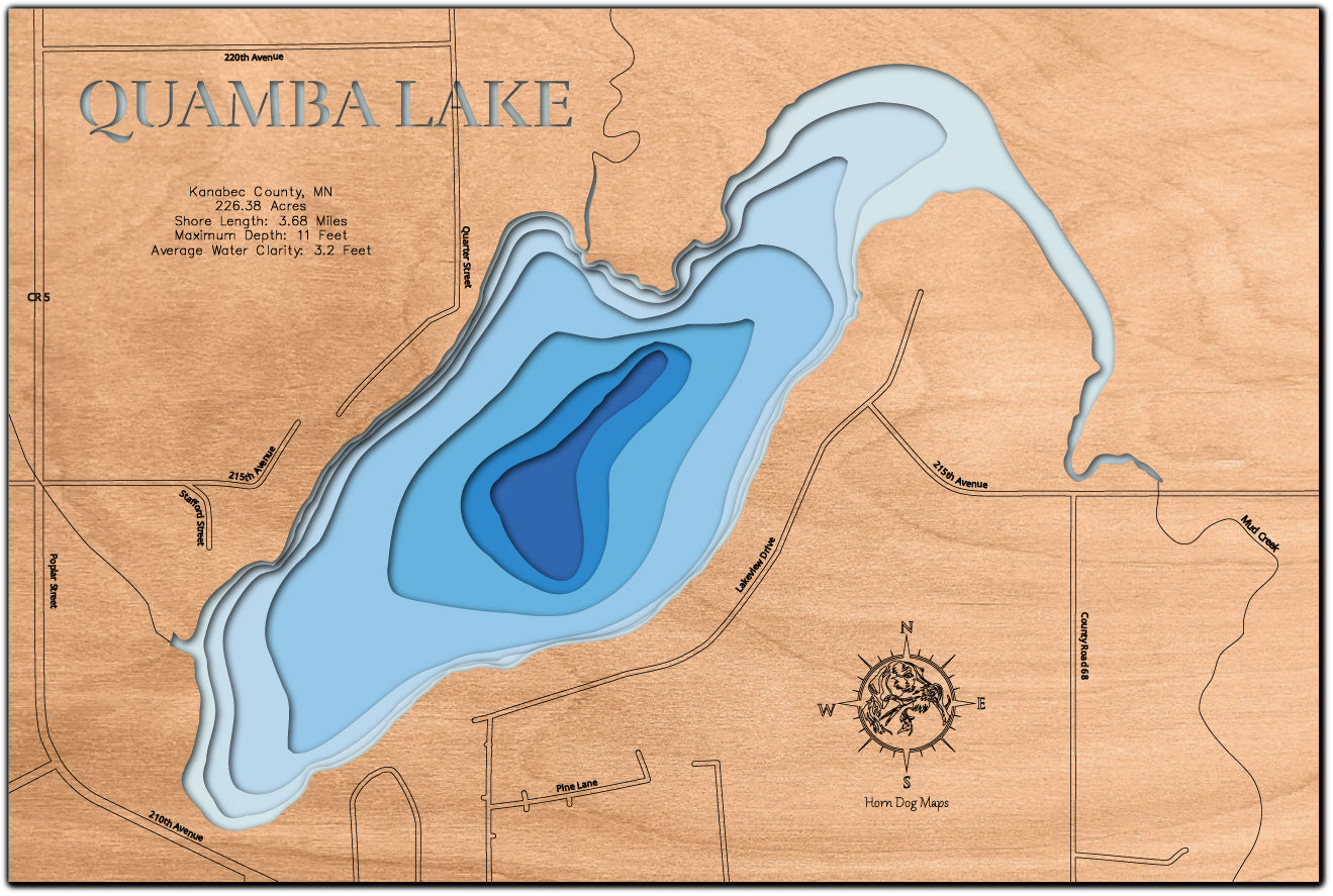 Celebrate the beauty of Quamba Lake in Kanabec County, MN with this detailed 3D lake map. It’s more than decor—it’s a piece of art that keeps your favorite lake close to home.