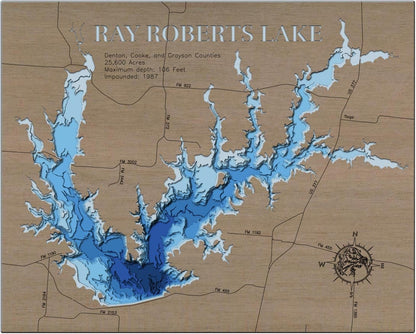 From fishing and kayaking to serene hikes along its shores, Ray Roberts Lake in Denton, Cook, and Grayson County, Texas offers endless opportunities for enjoyment. This detailed 3D lake map brings the essence of the lake into your home as decor and art, making it perfect for your cabin or living space.