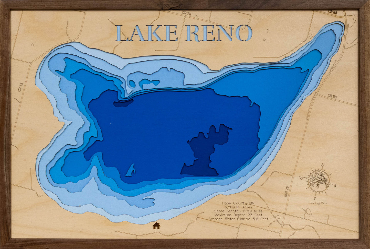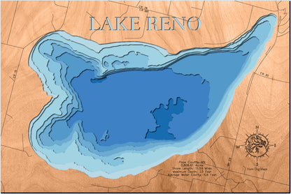 From fishing and kayaking to serene hikes along its shores, Lake Reno in Pope County, MN offers endless opportunities for enjoyment. This detailed 3D lake map brings the essence of the lake into your home as decor and art, making it perfect for your cabin or living space.