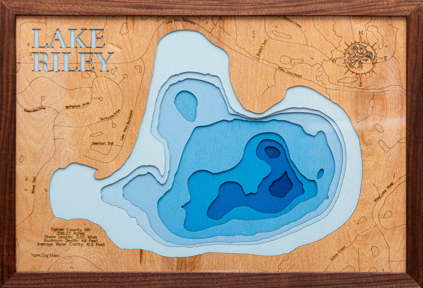 From fishing and kayaking to serene hikes along its shores, Lake Riley in Carver County, MN offers endless opportunities for enjoyment. This detailed 3D lake map brings the essence of the lake into your home as decor and art, making it perfect for your cabin or living space.