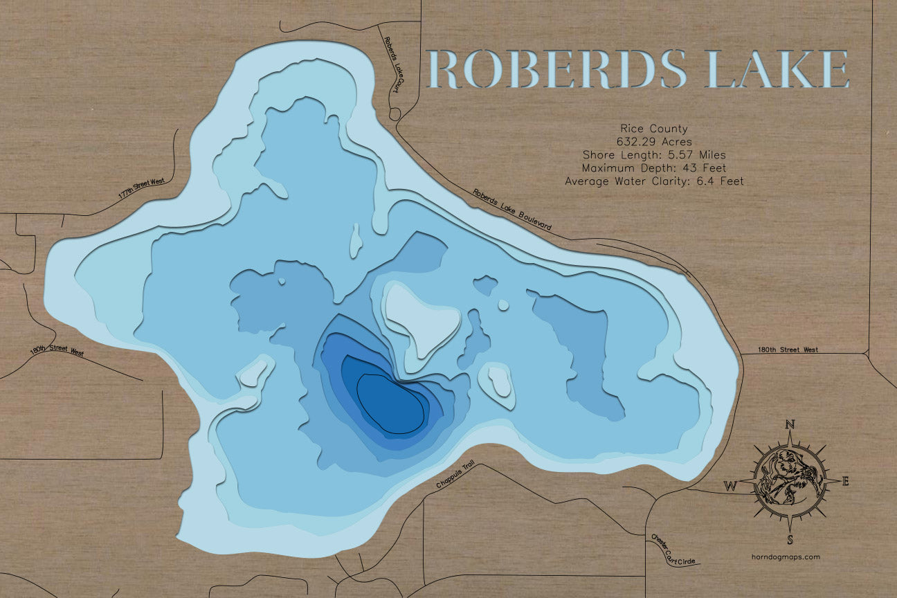 From fishing and kayaking to serene hikes along its shores, Roberds Lake in Rice County, MN offers endless opportunities for enjoyment. This detailed 3D lake map brings the essence of the lake into your home as decor and art, making it perfect for your cabin or living space.