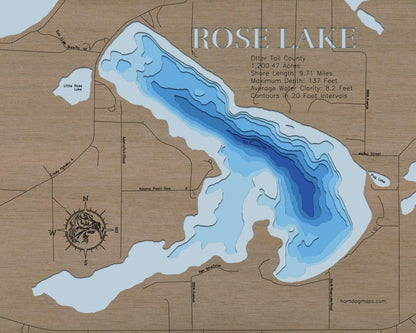 From fishing and kayaking to serene hikes along its shores, 3d Lake Map of Rose Lake in Otter Tail County, MN offers endless opportunities for enjoyment. This detailed 3D lake map brings the essence of the lake into your home as decor and art, making it perfect for your cabin or living space.