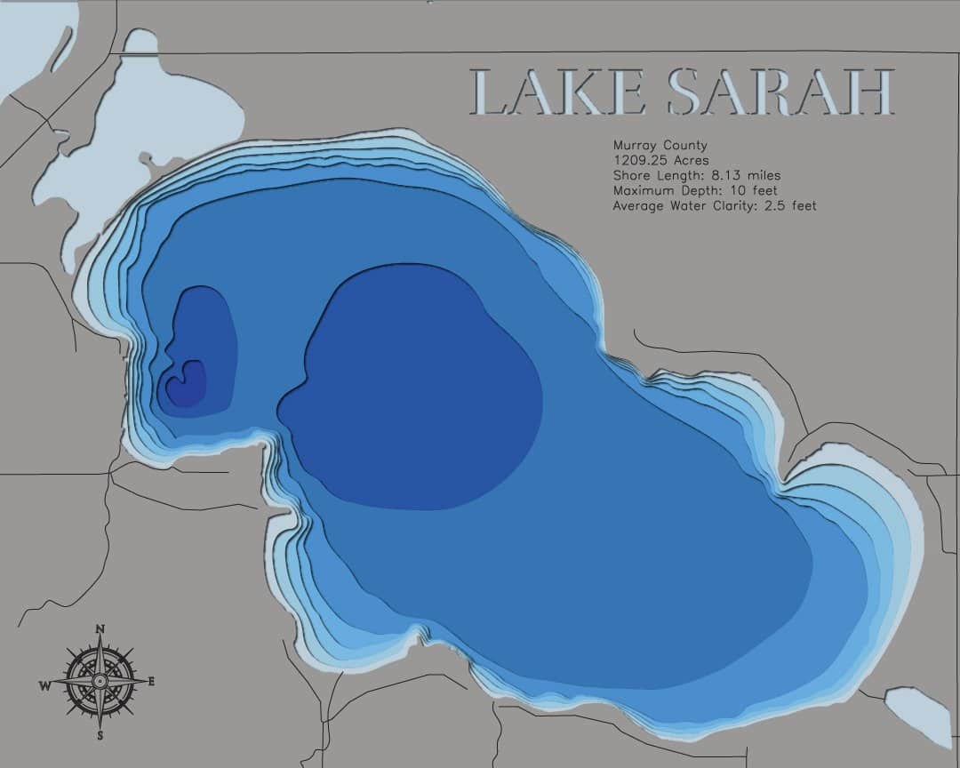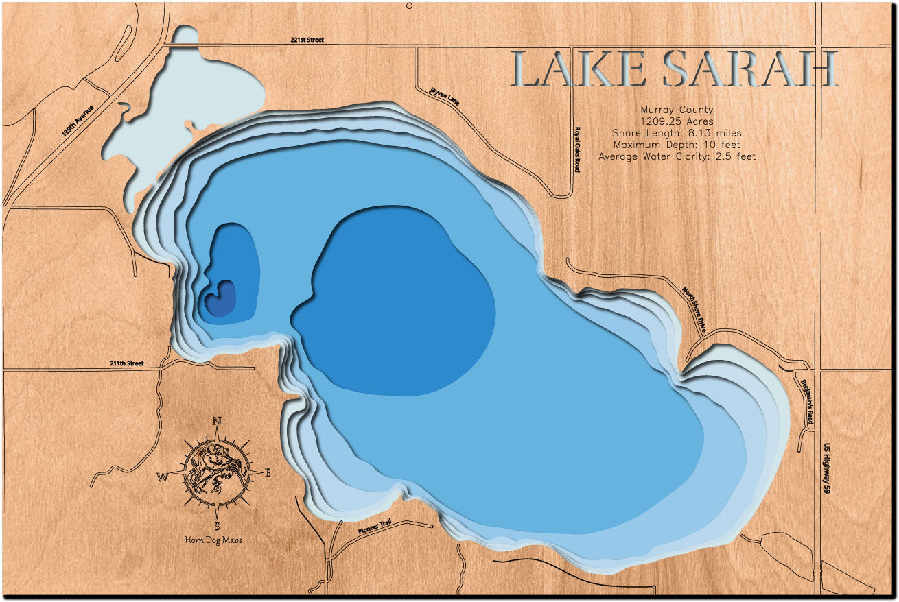 This 3D lake map transforms your memories of Lake Sarah in Murray County, MN into an artistic centerpiece. It’s perfect for enhancing your cabin or home’s decor.