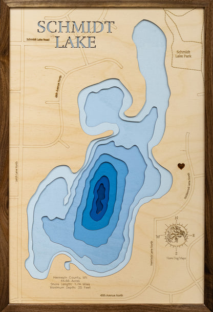 Capture the magic of Schmidt Lake in Hennepin County, MN with this detailed 3D lake map. It’s a stunning way to transform your cabin or home into a lakeside retreat.