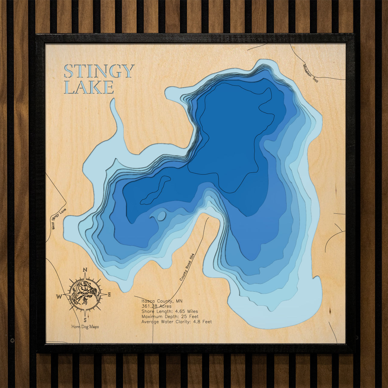 Visitors to Stingy Lake in Itasca County, MN can enjoy activities like fishing, boating, and hiking. This 3D lake map is not just decor but a piece of art that brings memories of your cabin or lakeside retreat into your home.