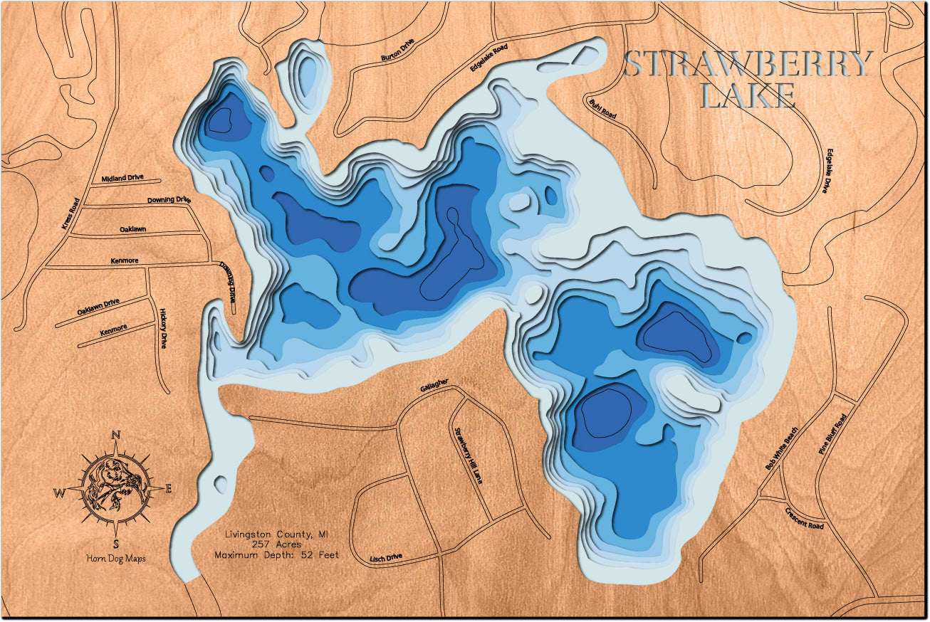 Perfect for cabin decor or home art, this 3D lake map is a beautiful tribute to Strawberry Lake in Livingston County, MI. It helps you preserve the special memories of time spent by the lake.