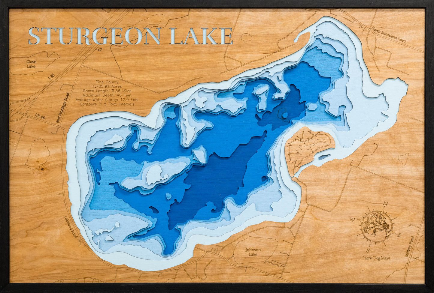 From fishing and kayaking to serene hikes along its shores, 3d Lake Map of Sturgeon Lake in Pine County, MN offers endless opportunities for enjoyment. This detailed 3D lake map brings the essence of the lake into your home as decor and art, making it perfect for your cabin or living space.