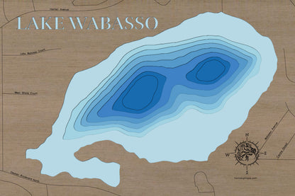 From fishing and kayaking to serene hikes along its shores, Lake Wabasso in Ramsey County, MN offers endless opportunities for enjoyment. This detailed 3D lake map brings the essence of the lake into your home as decor and art, making it perfect for your cabin or living space.