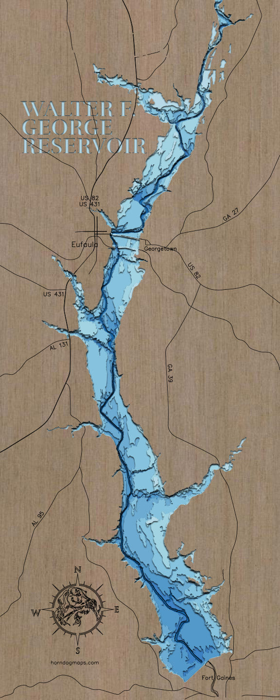 From fishing and kayaking to serene hikes along its shores, Walter F George Reservoir in Barbour County, AL offers endless opportunities for enjoyment. This detailed 3D lake map brings the essence of the lake into your home as decor and art, making it perfect for your cabin or living space.