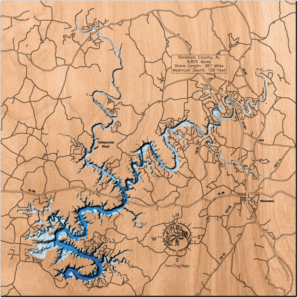 Visitors to Lake Wedowee in Randolph County, AL can enjoy activities like fishing, boating, and hiking. This 3D lake map is not just decor but a piece of art that brings memories of your cabin or lakeside retreat into your home.