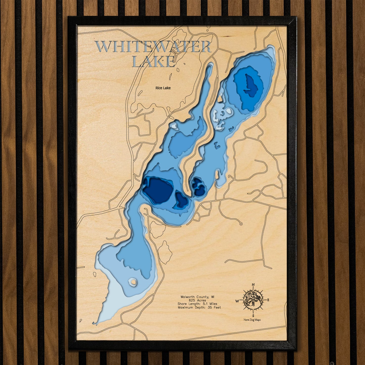 From fishing and kayaking to serene hikes along its shores, Whitewater Lake in Walworth County, WI offers endless opportunities for enjoyment. This detailed 3D lake map brings the essence of the lake into your home as decor and art, making it perfect for your cabin or living space.